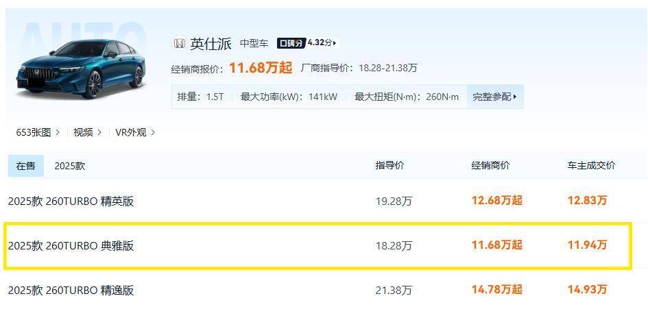 11.68万能买到的是英仕派的典雅版车型,新车指导价18.28万元,对应的差不多是雅阁的豪华版。不过,目前雅阁豪华版优惠完在13万左右,虽然配置上多了Honda SENSING驾驶辅助系统,但一口价没有英仕派来得那么低,因此如果不是特别在乎这套L2级驾驶辅助系统的话,英仕派的入手门槛反而更低一些。