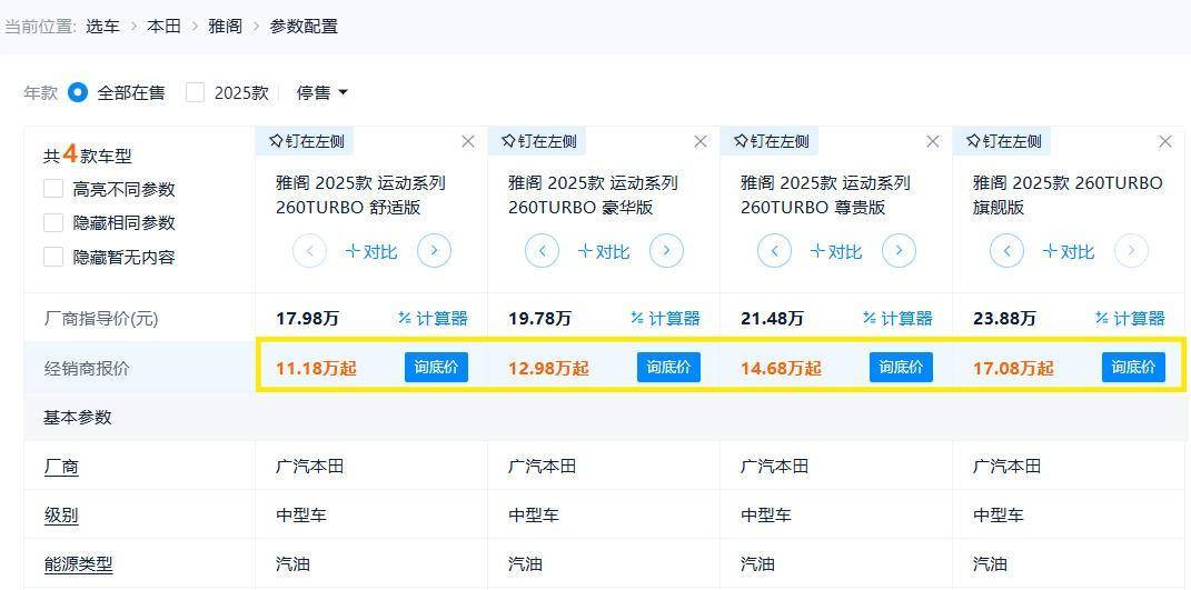当然了,雅阁还有一个配置非常低的舒适版车型,那个版本的价格目前已经拉低到了11.18万起,价格是足够低了,但配置又不如英仕派的典雅版。所以综合来说,如果你就12万左右的裸车预算,那英仕派典雅版还真就是个挺不错的选择。